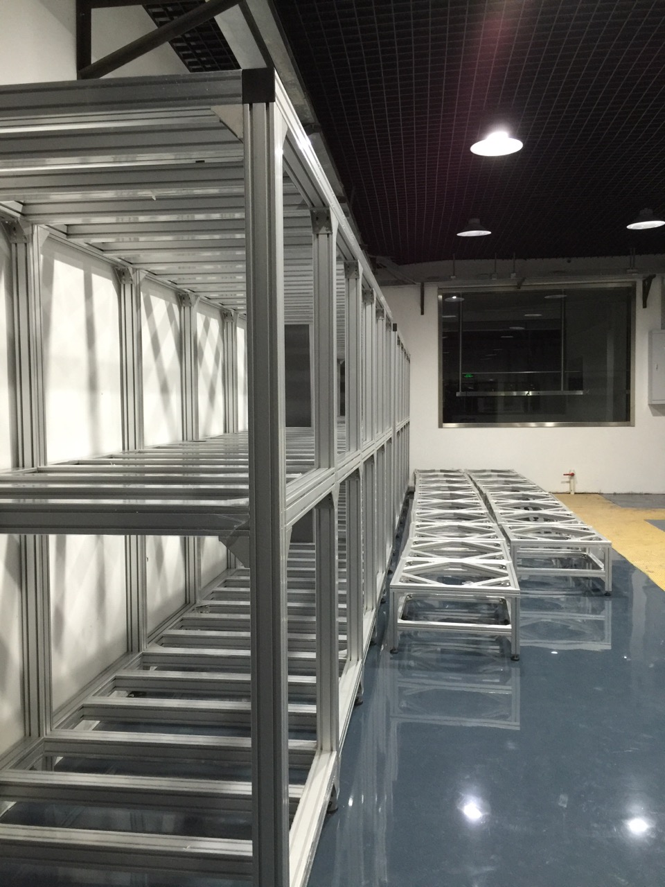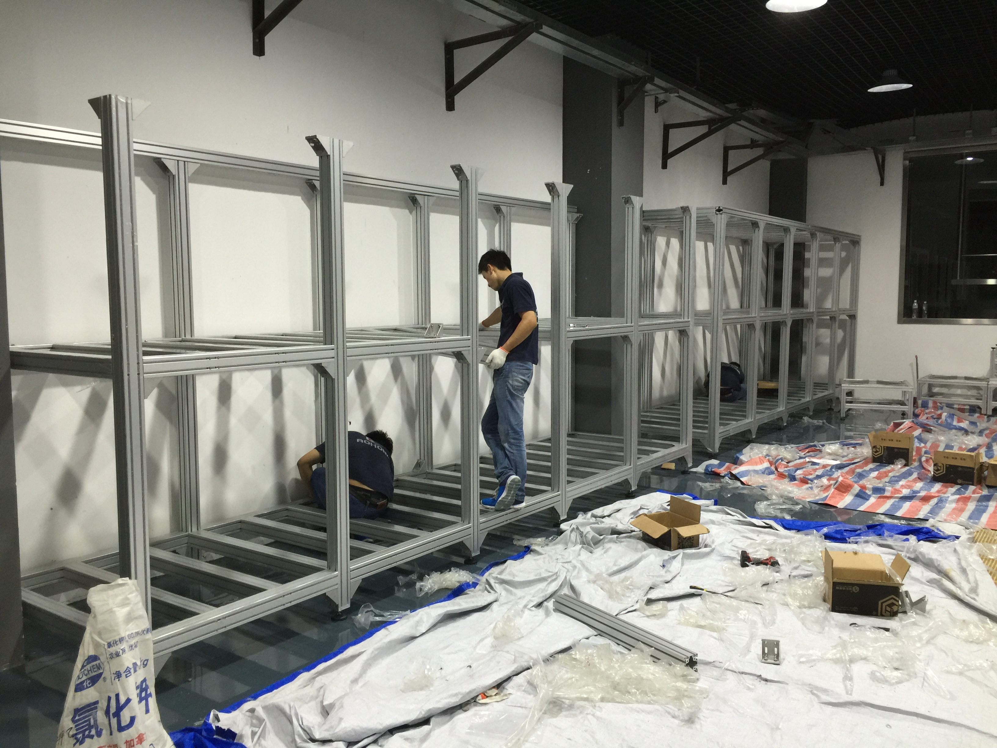 了解朱經理的項目需求后,我們立刻對朱經理項目進行設計,朱經理的項目施工在崇明中華鱘夢園,約有200平方的占面積,每個定制鋁型材框架,3米,長15米的,承載力要達10噸,我們整個鋁框架的方案全部采用歐標80120鋁型材做立柱,8080鋁型材做橫梁,結構連接采用12.9級高強度不銹鋼螺栓+打孔連接,并外面用直角件加固連接保確承重安全及結構穩定。工藝,是加工好后,現場施工。自方案設計到生產總15天,并在5天內完成上門施工。